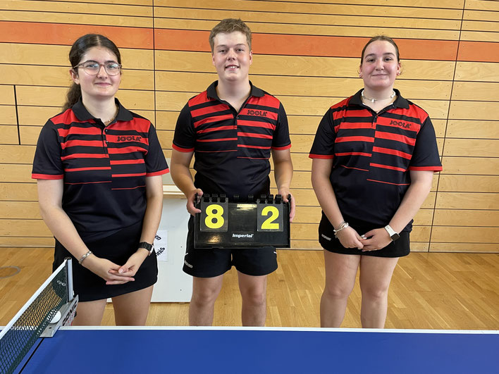 Auf der Welle des Erfolgs schwimmt zurzeit die 1. Jugendmannschaft, nach dem Sieg am vergangenen Donnerstag in Kempten, konnte Antonia Wind, Lara Kübler und Julian Linder einen 9:1-Sieg gegen den TSV Durach folgen lassen. Eine makellose Spielbilanz hatten Antonia Wind und Lara Kübler. Der erst 11-Jährige Julian Linder, konnte sich nach zwei tollen Siegen in die Siegerliste eintragen. Vor dem letzten Spieltag steht das Team mit 9:1 Punkten unangefochten auf dem 1. Tabellenplatz und ist praktisch auf dem Sprung in die Bezirksoberliga.